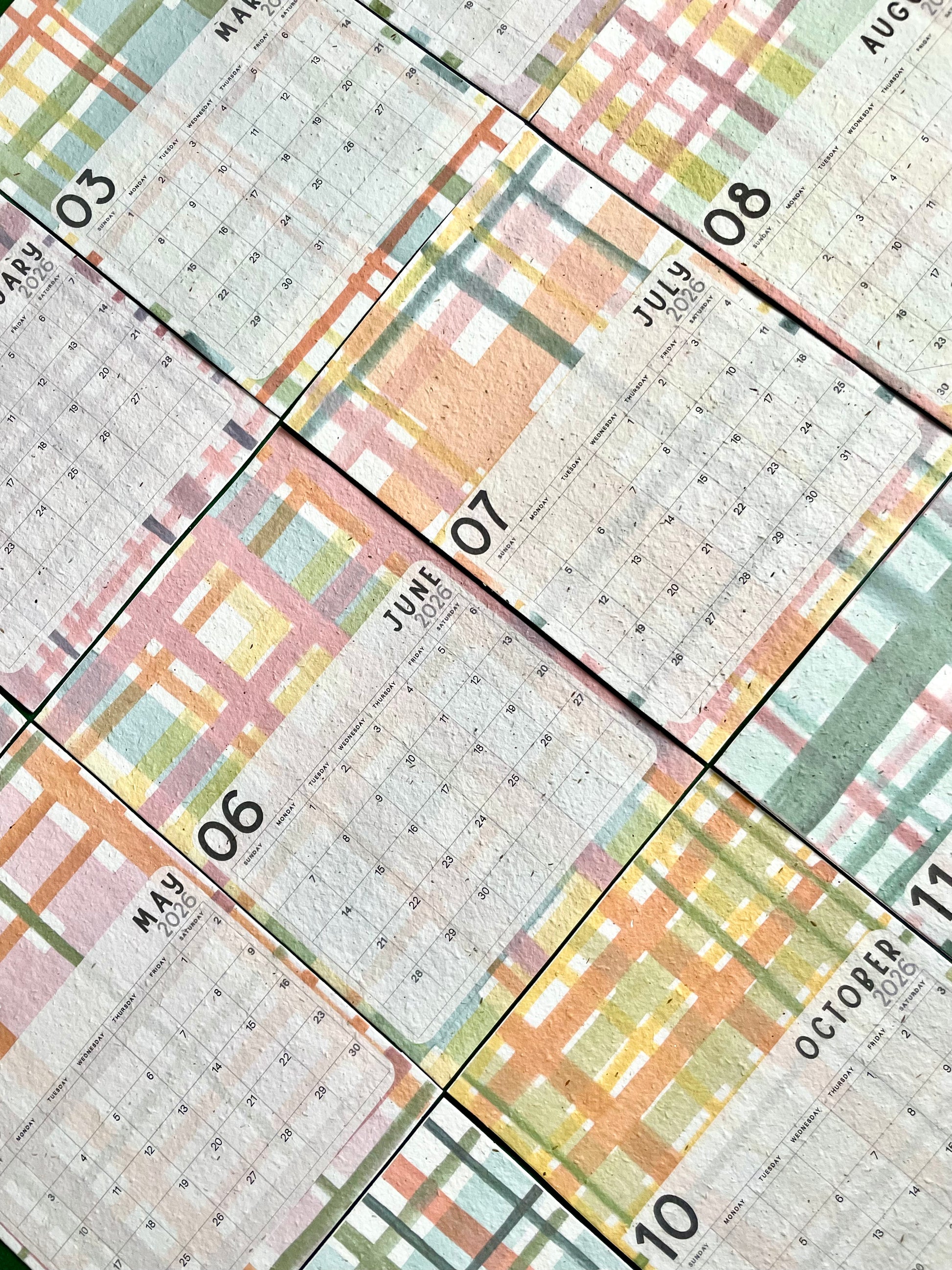 A handmade recycled paper calendar, each month embedded with a range of wildflower seeds for planting after use.
