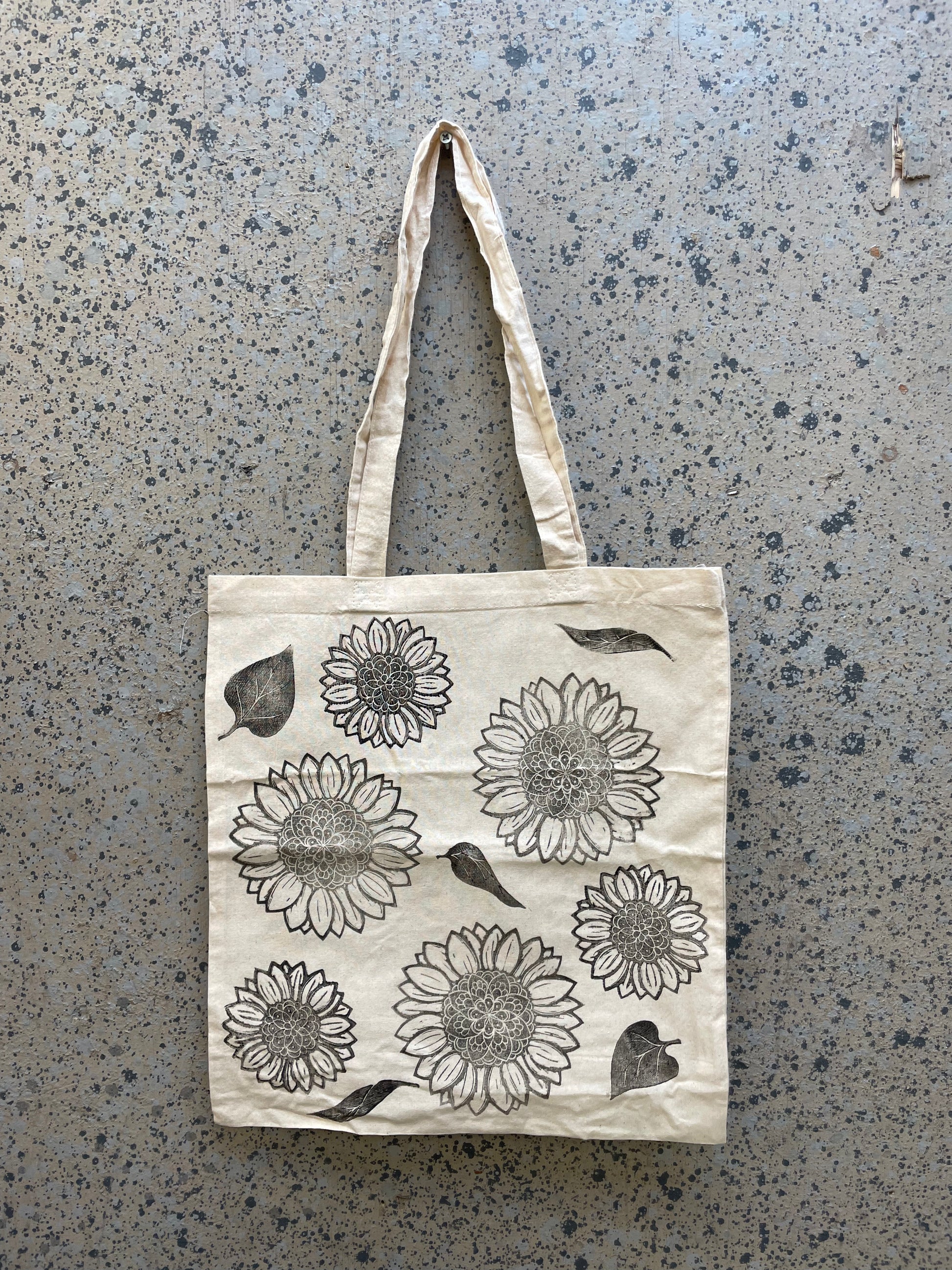 Hand printed lino printed cotton canvas tote bag with sunflower mandala and leaves design.